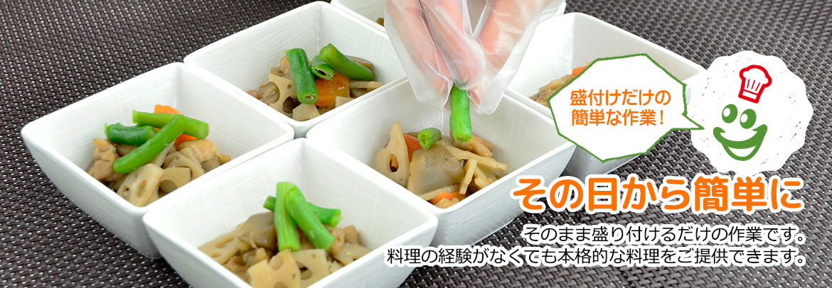付け合せは全て別々に処理しているので、彩りも美しく、食欲をそそります。規格品と異なり、手作りにて生産しており、全ての食材に様々な加工をしてご提供できます。